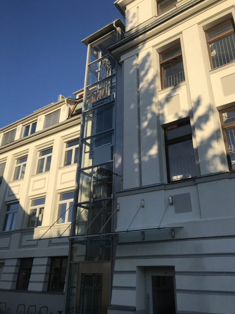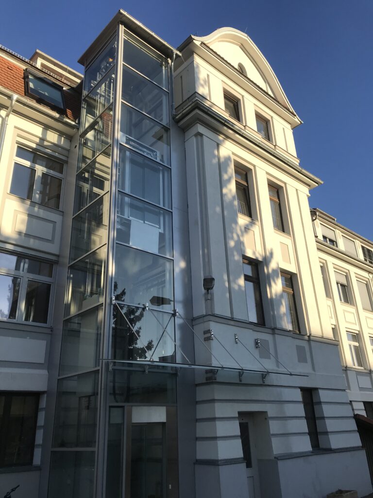 Ein historisches Gebäude mit ganz unterschiedlichen Nutzungen hat eine verglaste Aufzugsanlage erhalten. Im vorhandenen Treppenhausbereich wurde die Eingangstür verlegt und in jeder der 3 Etagen ist der Zugang vom Aufzug in die jeweilige Etage in eine andere Richtung rein gehend. Im Dachgeschossbereich wurde die Mansarde geöffnet, sodass der Aufzug sich harmonisch in die Dachfläche integriert. Da die genutzten Einheiten sehr großzügig gehalten sind, musste in enger Zusammenarbeit mit dem Fachplaner für Brandschutz gearbeitet werden. Der Aufzug gliedert sich in das Gesamtensemble ein, und bietet einen grandiosen Ausblick in Richtung Stadt.