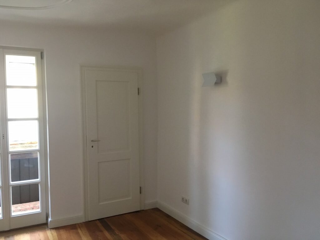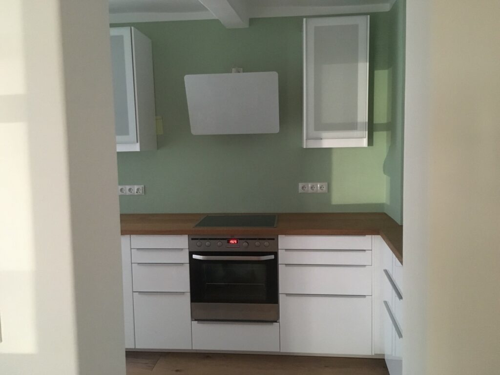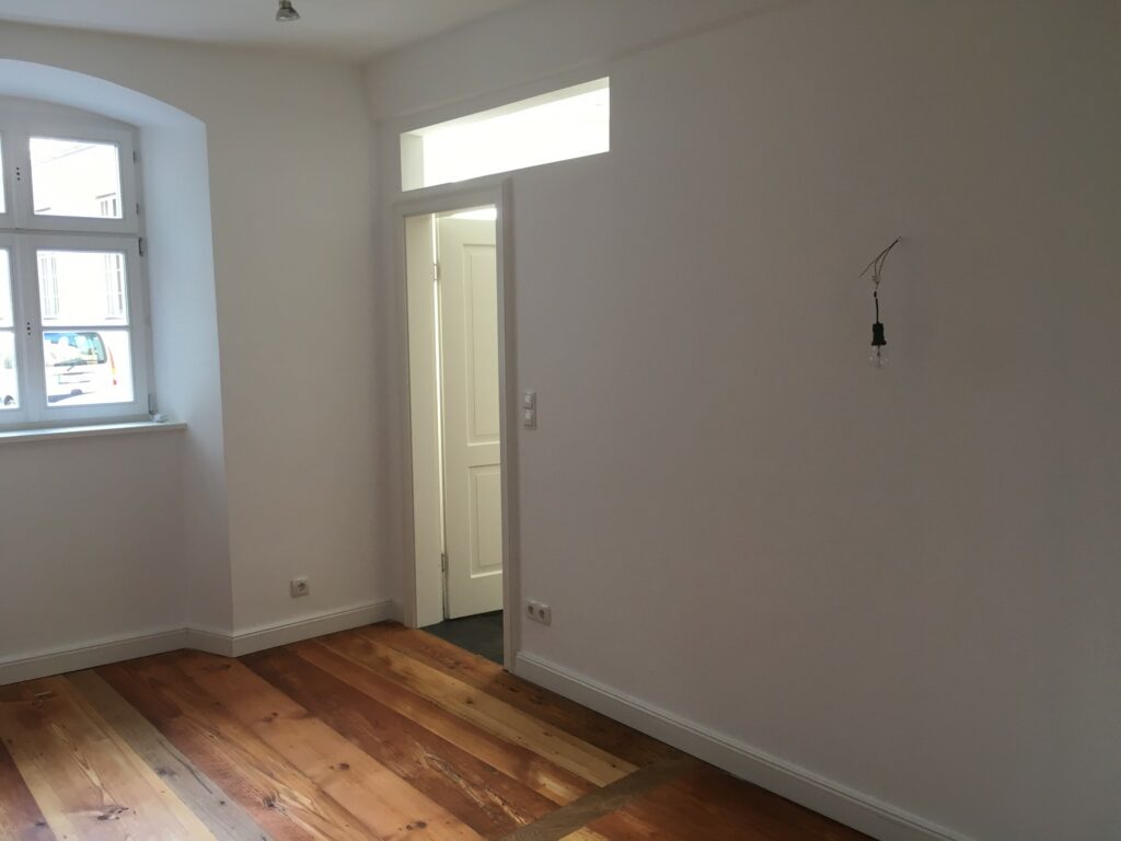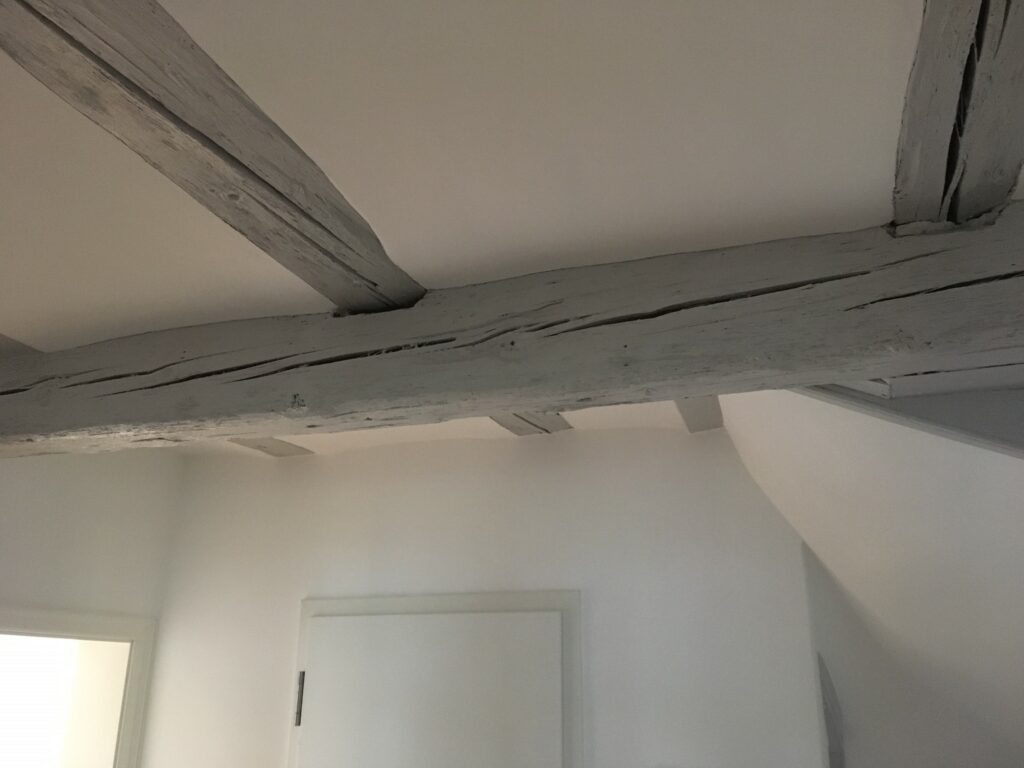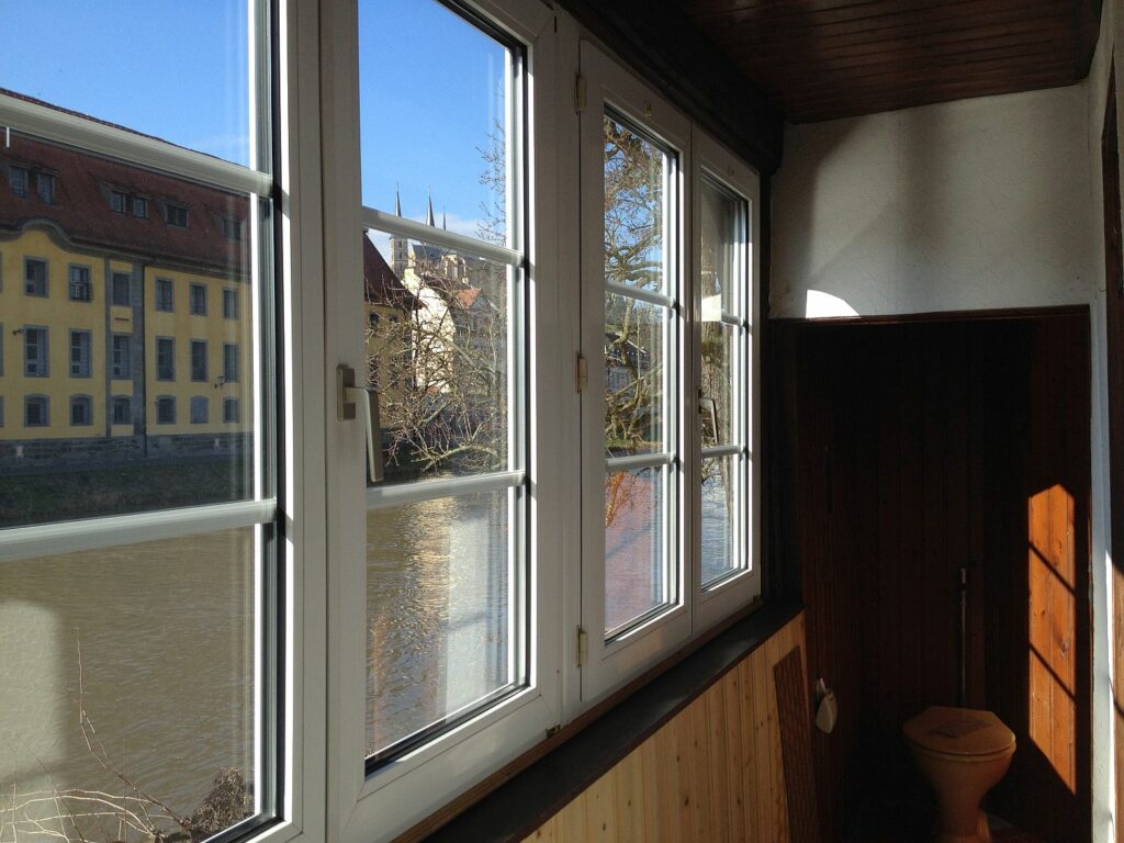 „Fischerhaus, dreigeschossiges Hauptgebäude in Fachwerk mit steilem Satteldach, traufständig zur Regnitz gerichtetes Wohnhaus zweigeschossig mit Laubengängen über massivem Keller.“ In Klein Venedig liegt diese traumhafte Wohnung mit Blick auf die Regnitz und die Domtürme. In dieses Kleinod hat sich der Bauherr direkt verliebt. Die Wohnung war komplett an Decken und Wänden mit Holzdielen verkleidet, der Boden mit mehreren Lagen Spanplatten und Teppichböden belegt. Dies war unser Glück. Denn beim Entfernen des Bodenaufbaus kam der alte Holzboden aus dunklen Eichenkreuzen mit dazwischen liegenden hellen Kieferndielen hervor. Dieser Boden wurde aufbereitet und bildet nun einen der Blickfänge der Wohnung. Vergangene Wasserschäden wurden behoben. Die alten Elektroöfen wurden gegen eine neue Gastherme ausgetauscht und eine Wandheizung wurde installiert. Das innenliegende Bad ist an die Strassenseite verlegt worden und hat somit ein Fenster und ist hell und freundlich gestaltet. Die vorhandenen Küchenfenster wurden gegen große Fensterelemente ausgetauscht die diesem Raum seine Helligkeit geben. Die alten Fliesenböden in der Diele und Küche wurde entfernt und gegen warme Holzdielen ausgetauscht. Das vorhandene Holzgebälk wurde freigelegt und in ein warmes grau getaucht welches mit dem weiteren Farbkonzept der Wohnung harmoniert. Der kleine Laubengang wurde farblich aufgewertet und lädt nun zum Verweilen und dem Zuschauen der Schifffahrt auf der Regnitz ein.