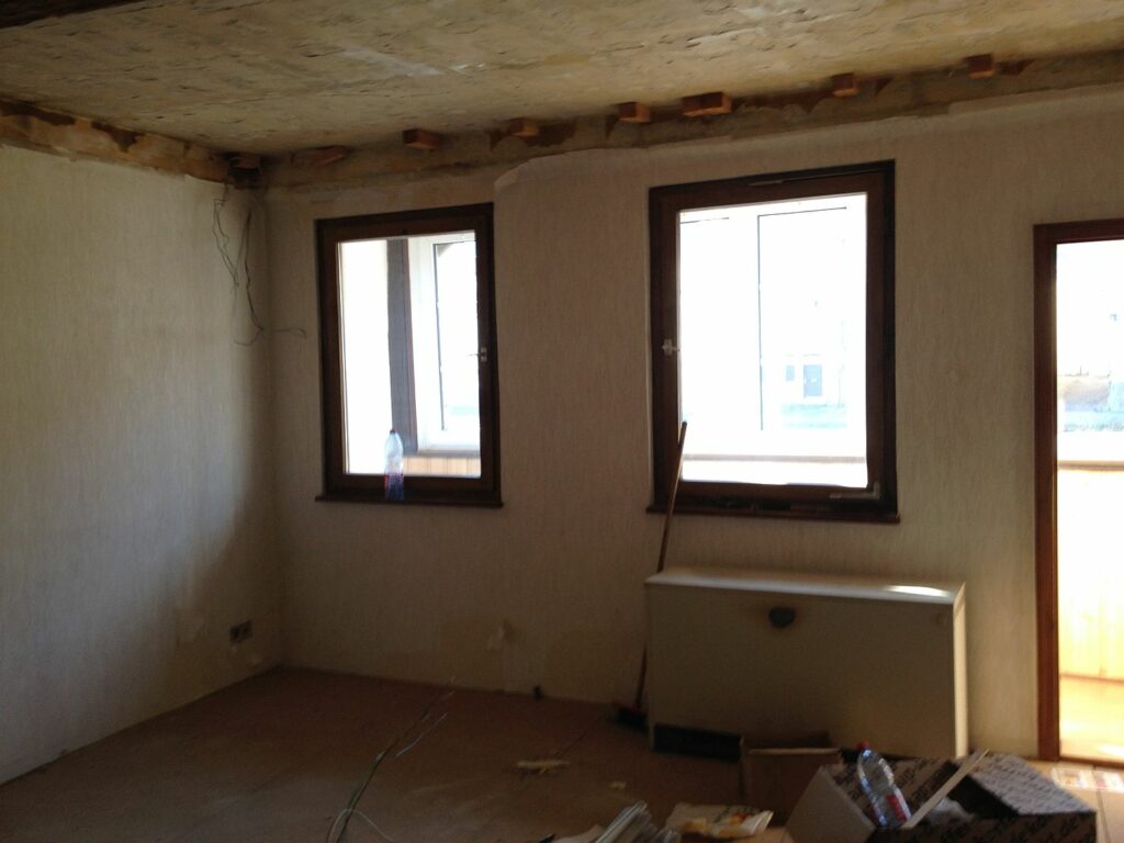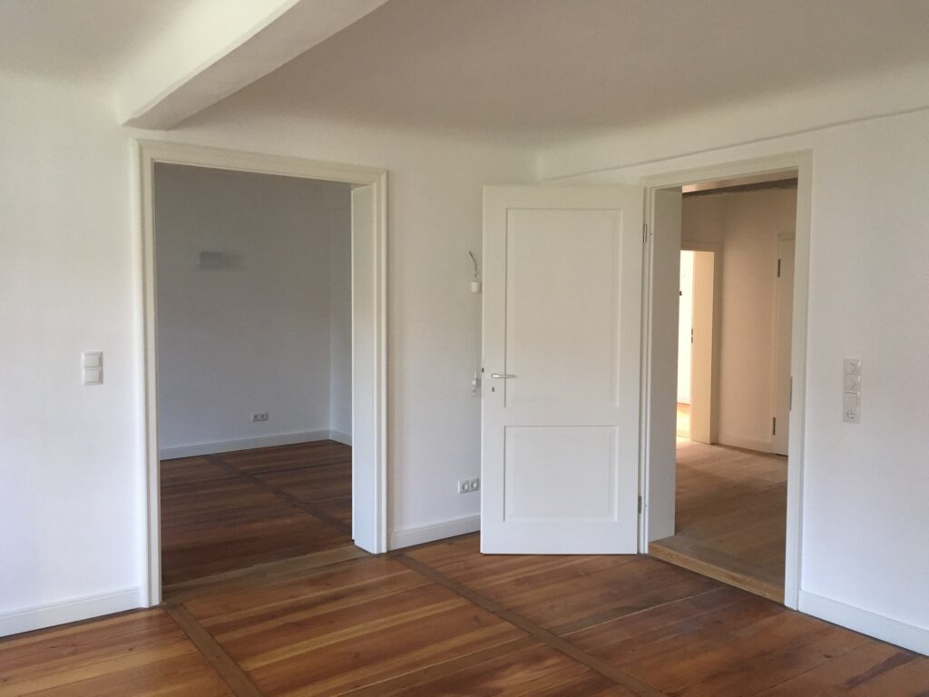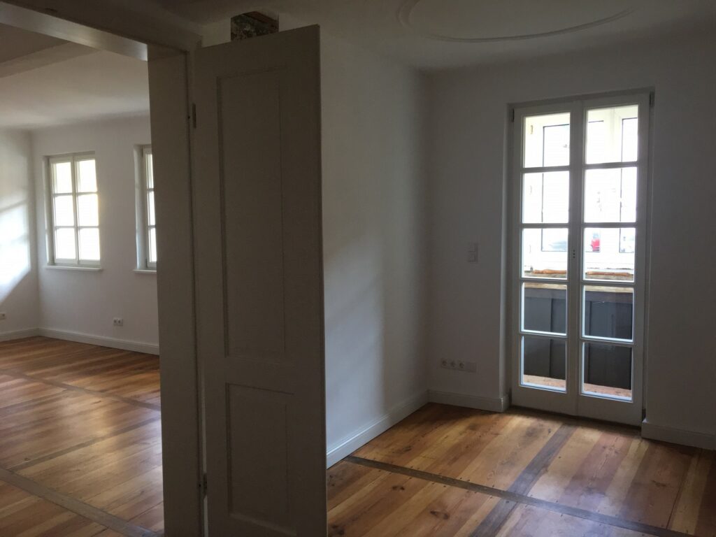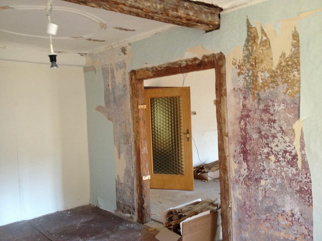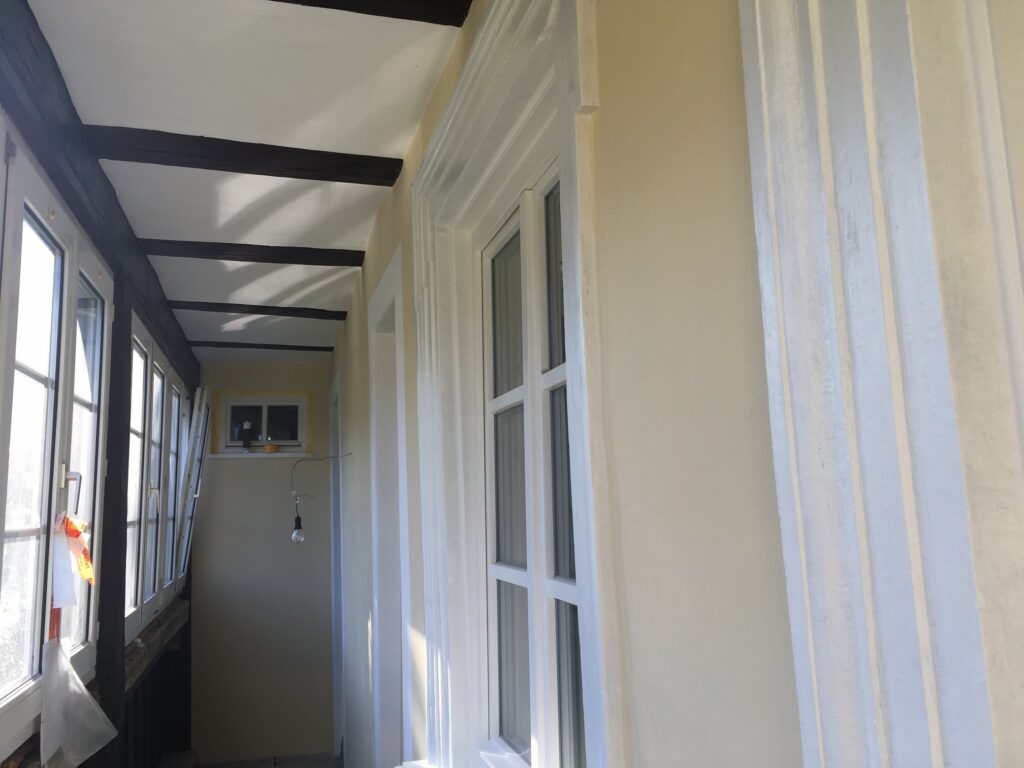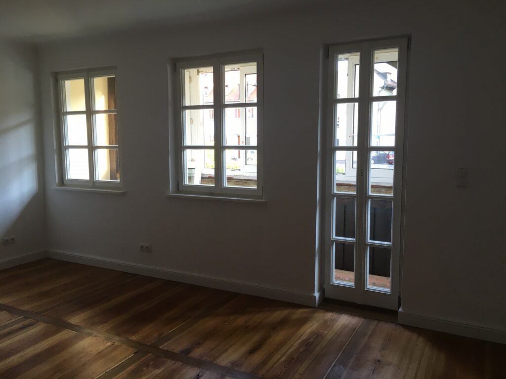 „Fischerhaus, dreigeschossiges Hauptgebäude in Fachwerk mit steilem Satteldach, traufständig zur Regnitz gerichtetes Wohnhaus zweigeschossig mit Laubengängen über massivem Keller.“ In Klein Venedig liegt diese traumhafte Wohnung mit Blick auf die Regnitz und die Domtürme. In dieses Kleinod hat sich der Bauherr direkt verliebt. Die Wohnung war komplett an Decken und Wänden mit Holzdielen verkleidet, der Boden mit mehreren Lagen Spanplatten und Teppichböden belegt. Dies war unser Glück. Denn beim Entfernen des Bodenaufbaus kam der alte Holzboden aus dunklen Eichenkreuzen mit dazwischen liegenden hellen Kieferndielen hervor. Dieser Boden wurde aufbereitet und bildet nun einen der Blickfänge der Wohnung. Vergangene Wasserschäden wurden behoben. Die alten Elektroöfen wurden gegen eine neue Gastherme ausgetauscht und eine Wandheizung wurde installiert. Das innenliegende Bad ist an die Strassenseite verlegt worden und hat somit ein Fenster und ist hell und freundlich gestaltet. Die vorhandenen Küchenfenster wurden gegen große Fensterelemente ausgetauscht die diesem Raum seine Helligkeit geben. Die alten Fliesenböden in der Diele und Küche wurde entfernt und gegen warme Holzdielen ausgetauscht. Das vorhandene Holzgebälk wurde freigelegt und in ein warmes grau getaucht welches mit dem weiteren Farbkonzept der Wohnung harmoniert. Der kleine Laubengang wurde farblich aufgewertet und lädt nun zum Verweilen und dem Zuschauen der Schifffahrt auf der Regnitz ein.