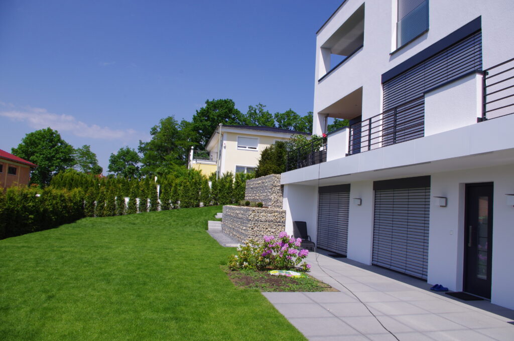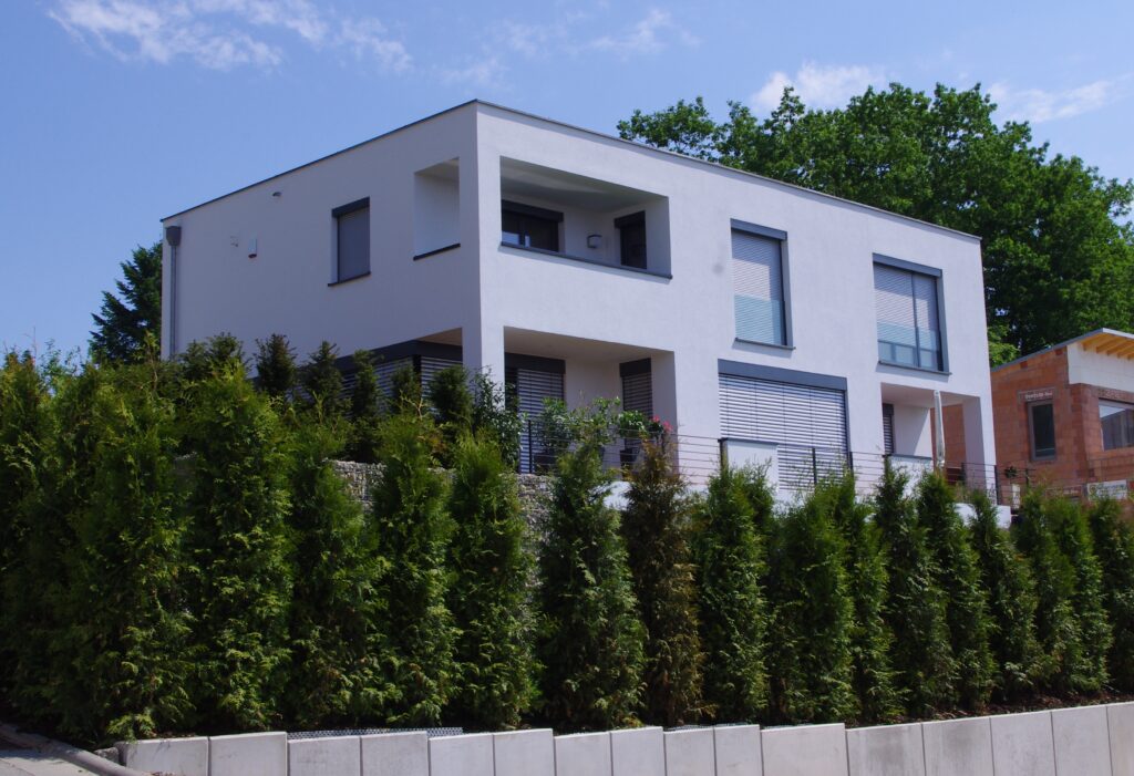 Die wesentlichen Entwurfsthemen waren eine klare Formensprache zu entwickeln und zu realisieren: Die Dimension erlebbar zu machen. Das Raumkonzept war klar. Die obere Geschossebene bildet den Schlafbereich mit Kinderzimmern und den beiden Bädern sowie einer Diele zum Spielen, Lesen und Entspannen. Die Treppe, im Inneren des Hauses, erhält über eine Lichtpyramide zusätzliches Licht und bietet ein unverwechselbares Licht- und Schattenspiel. Der Wohnbereich geht fliesend in den Außenbereich über ohne jedoch zu viel Einblick zu gewähren. Verglaste hohe Fensterelemente bieten einen freien Blick ins Tal. Durch die Grundrissgestaltung sind Rückzugsbereiche und ein uneinsichtiger Wohnbereich als Ruhepol garantiert, unterstrichen durch den offenen Kamin. Der Koch- und Essbereich kann in einzelne Räume unterteilt werden oder durch das Schiebeelement zu einem Raum verbunden werden. Der Küchenblock in der Mitte bildet den Kern des Raumes. Durch die atmosphärischen Materialien wie Stein I Holz I Glas wurde sich auf das Wesentliche konzentriert. Die vorgelagerte Terrassenfläche zieht sich entlang der Frontfassade. Der Austritt ist vom Koch-, Speise- und Wohnbereich aus möglich. Dies gibt dem Haus einen unverwechselbaren Charakter. In der unteren Ebene wurden im hinteren Bereich, zum Hang, die kalten Räume integriert. Nach vorne bestimmt eine Fensterfront das untere Geschoss. Hohe Glaselemente lassen viel Licht in den Gäste- und Arbeitsbereich, der durch eine eigene Eingangstür erschlossen werden kann. Der Gartenbereich wurde auf die untere Ebene hochgezogen und bietet eine große Liege- und Spielfläche. Die Aussengestaltung harmoniert mit dem Gebäude, Garbionen in Verbindung mit Holzbelägen gliedern sich in die Landschaft ein.